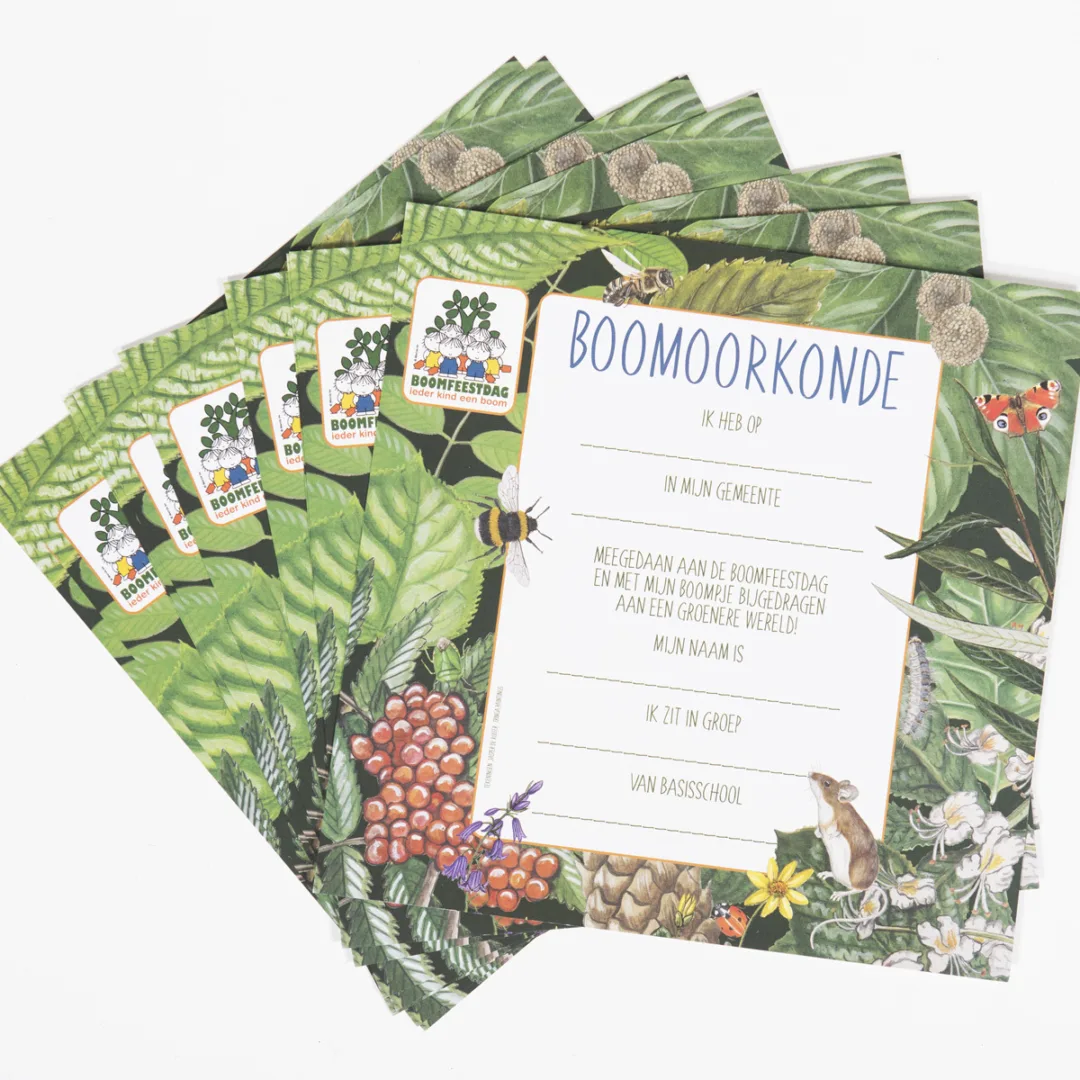 Deze Boom-Oorkonde is het ultieme bewijs van jouw deelname aan de Boomfeestdag. Ook voor de boom die je hebt geplant is er een officieel document: het Bomenpaspoort. Met dit paspoort kun je je boom door de jaren heen volgen. Wil je weten hoe? Kijk dan in onze shop voor het Boomfeestdag-BomenPaspoort!