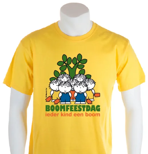 Speciaal voor de Nationale Boomfeestdag is dit gele T-shirt gemaakt. De voor- en achterzijde zijn bedrukt. Op de voorzijde staat in het groot het Boomfeestdaglogo en op de achterkant prijkt de tekst: "Dit is mijn TREE shirt"